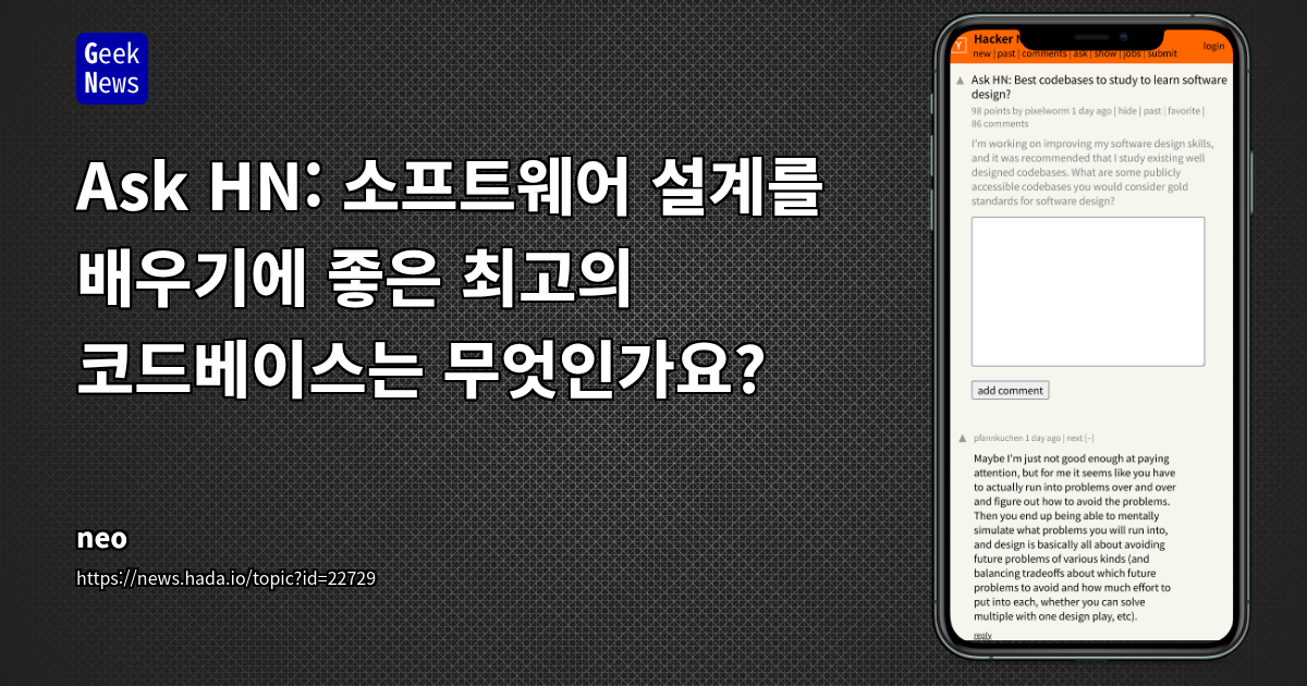 소프트웨어 설계 능력을 키우려면 단순히 잘 설계된 코드를 읽는 것만큼이나 설계 의도를 담은 문서를 함께 탐구하고, 시행착오를 겪으며 자신의 실전 프로젝트에 직접 적용하는 경험이 중요하다는 논의입니다. 대표적인 코드베이스로는 Git, Postgres, CPython, Rust 표준 라이브러리 등이 꼽혔으며, 설계 문서(PEP, RFC, ADR 등)의 중요성, 실패에서 배우는 경험, 나쁜 코드 분석 등 현실적 학습법도 강조되었습니다. 좋은 설계는 '보기 좋은 코드' 자체가 아니라 트레이드오프와 결정의 맥락을 담고 있어야 한다는 점이 주요 인사이트입니다.