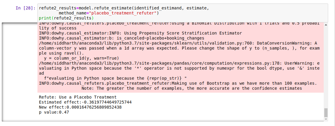 위약 처리 반증 (Placebo Treatment Refuter): 임의의 공변량을 처리 변수로 지정하고 분석을 다시 실행합니다. 가정이 정확했다면 새로 발견된 추정치는 0으로 수렴해야 합니다.