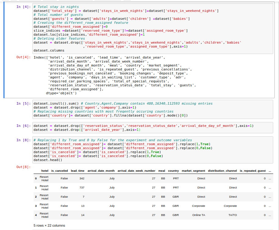 주말 숙박 일수 (stays_in_weekend_nights) + 주중 숙박 일수 (stays_in_week_nights)성인 (adults) + 어린이 (children) + 유아 (babies)예약된 방 유형 (reserved_room_type)과 배정된 방 유형 (assigned_room_type)이 다르면 1, 같으면 0.