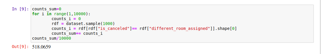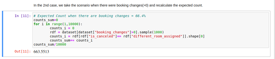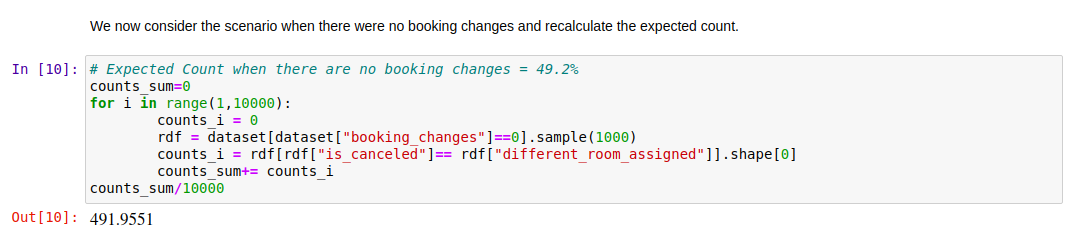 처음에 계산한 기대 빈도는 약 50%로 나왔는데, 이는 두 변수(취소 여부와 다른 방 배정 여부)가 무작위로 같은 값을 가질 확률을 의미합니다. 통계적으로 이 단계에서는 확실한 결론을 내릴 수 없었어요.