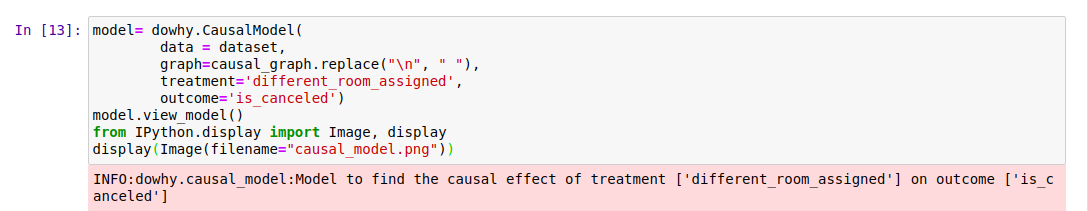 여기서 처리(Treatment)는 고객이 예약 시 선택한 것과 같은 유형의 방을 배정하는 것이고, 결과(Outcome)는 예약이 취소되었는지 여부입니다. 공통 원인(Common Causes)은 우리의 인과적 가정에 따라 결과와 처리 모두에 인과적으로 영향을 미치는 변수를 나타냅니다. 우리의 가정에 따르면, 이 기준을 만족하는 두 변수는 예약 변경 횟수와 관측되지 않은 혼란 변수입니다.